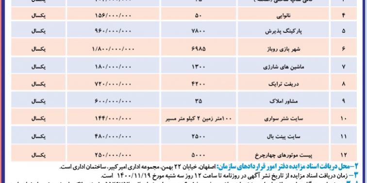 سازمان عمران زاینده رود به استناد آیین نامه معاملات سازمان و مصوبه هیت مدیره محترم در نظر دارد نسبت به اجاره اماکن تفریحی و ورزشی خود واقع در دهکده فرهنگی تفریحی زاینده رود بر اساس صرفه و صلاح سازمان از طریق مزایده عمومی اقدام نماید لذا متقاضیان میتوانند از تاریخ انتشار آگهی و در ساعات اداری جهت بازدید از اماکن مزایده به واحد فنی دهکده فرهنگی تفریحی زاینده رود واقع در دو کیلو متری شهر چادگان مراجعه نمایند.
