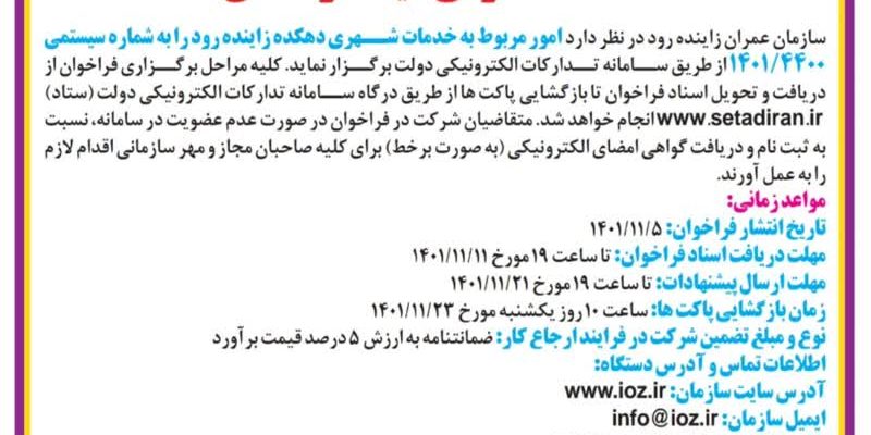 سازمان عمران زاینده رود در نظر دارد امور مربوط به خدمات شهری دهکده زاینده رود را به شماره سیستمی ۱۴۰۱/۴۴۰۰از طریق سامانه تدارکات الکترونیکی دولت برگزار نماید