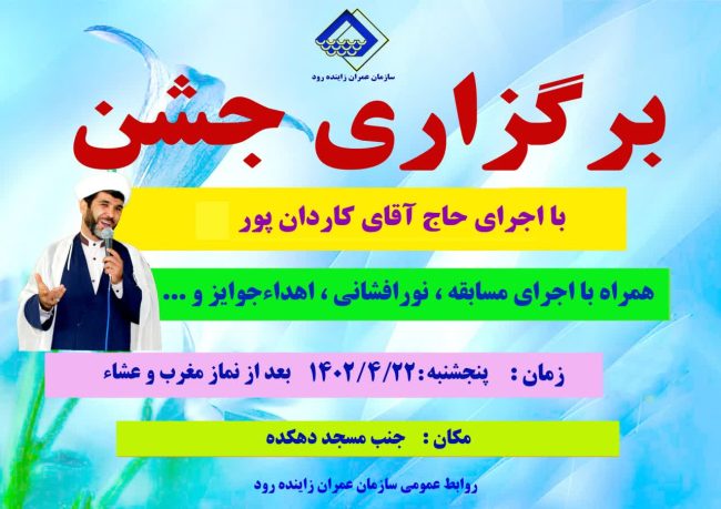 برگزاری جشن در اعیاد غدیر با اجرای آقای کاردان پور به همراه مراسم نورافشانی و اهدای جایزه واقع در جنب مسجد دهکده