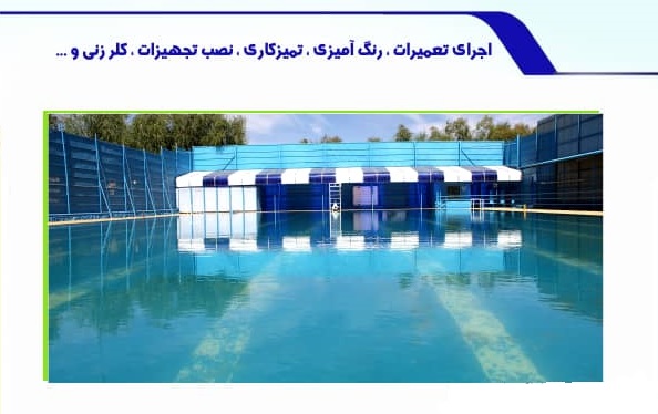 تعمیرات استخر روباز دهکده بمنظور ارائه خدمات تفریحی شامل رنگ آمیزی، نصب تجهیزات کلر زنی و سرویس