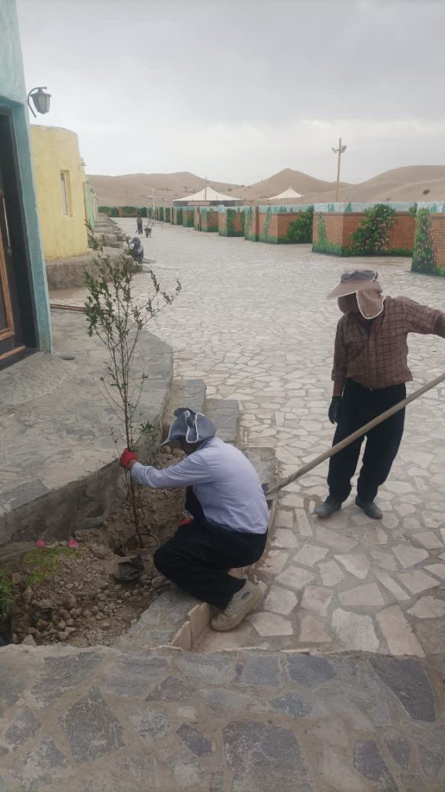 با توجه به شرایط آب و هوایی کویری کاشت انواع درخت و گل محمدی در اماکن مختلف و قسمت ورودی متناسب با شرایط آب و هوایی منطقه نمونه گردشگری واحه